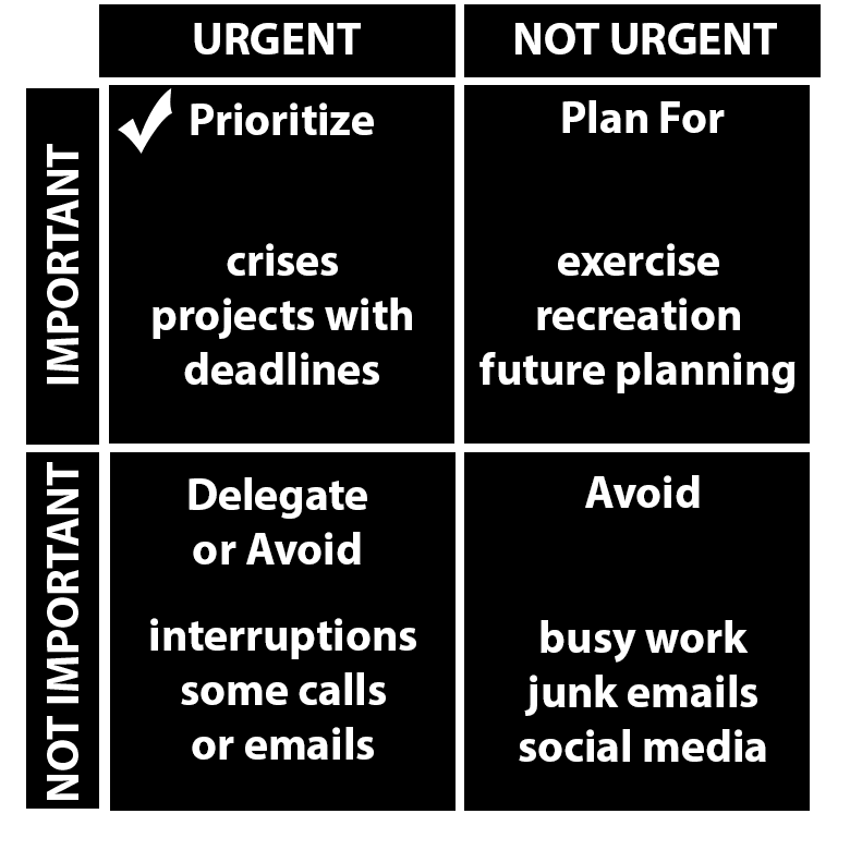 - Urgent and Important: These are your true priorities. Do these first. Examples might include submitting a grant proposal due today or returning a call from a major donor.
